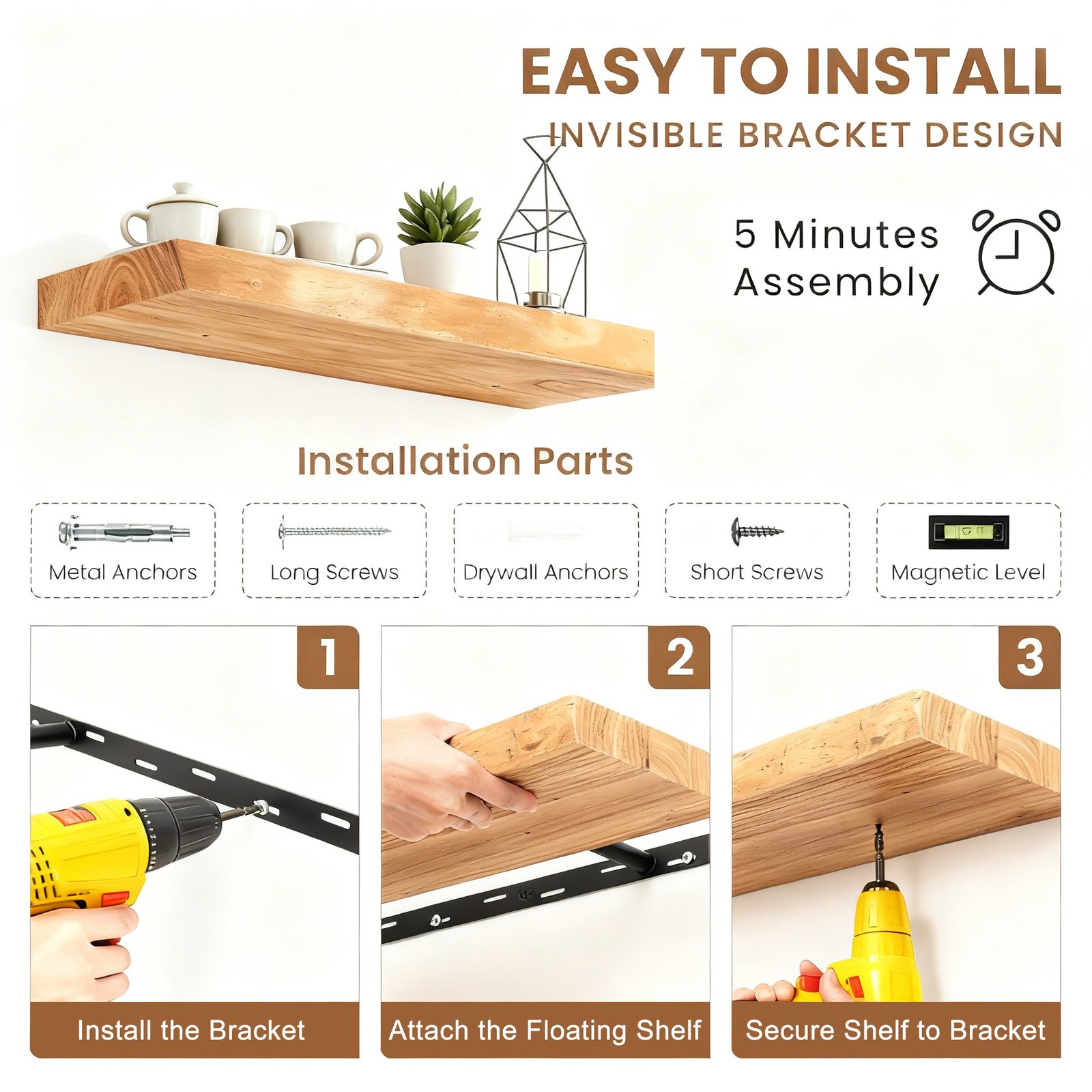 • Floating Shelf Brackets – Two solid steel concealed fixing rods are included. (130 & 140cm lengths supplied with 3 rods per shelf for extra strength).